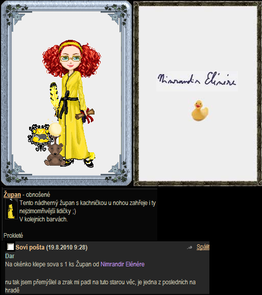 Ano, je to jeden z několika posledních očarovaných kachničkových županů na hradě! Každý, kdo si tento župan oblékne, promění se v kachničku! (Účinek županu jsem zdokumentovala na sobě, viz foto.) Neobvyklé zážitky zaručeny!