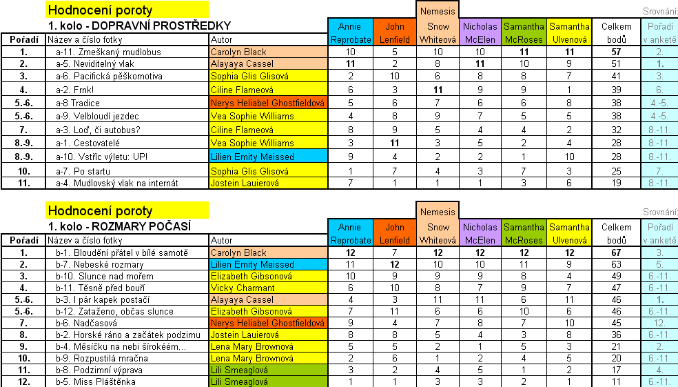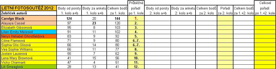 Protože i po sečtení bodů od poroty za obě fotky plus přepočtených bodů za umístění v anketě (vysvětleno podrobněji v 1. části hodnocení) drží CarolynBlack vedoucí pozici za celé 1. kolo a tedy průběžné 1. místo v letní fotosoutěži se 144 body. Na průběžném druhém místě ji dotahuje se 120 body Alayaya Cassel – a té za krk dýchají průběžně třetí Elizabeth Gibsonová se 103 a hned za ní Lilien Emity Meissed se 102 body. Přehlednou tabulku, která dává i představu o systému hodnocení, máte tady: