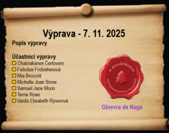 7. 11. 2025 byl typicky podzimní a sychravý večer. Nás sedm statečných jezevců se sešlo před hájenkou poblíž brány do lesa. Madam Ginevra už na nás čekala s tácem hrnečků plných horkého čaje a kakaa. Nemusela nás pobízet. V tom vlhku jsme všichni prostydli jen za ten krátký kousek od hradu. Kdo ví, co bude dál. Po krátkém dohadování, jestli se sedm osob dá rozdělit do dvojic nebo ne, jsme konečně zamířili k tajemné bráně.